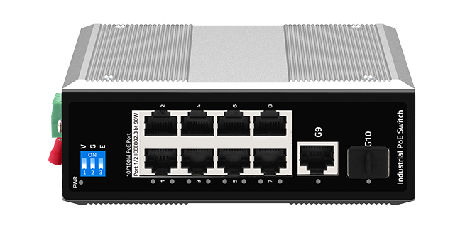 | IES200-LS1108P | 8-port 100M PoE + 1-port Gigabit RJ45 + 1-port Gigabit SFP Unmanaged Industrial Switch, Industrial-grade 48~55V input (4-pin terminal block / DC 2.1), operating temperature -40°C~75°C; DIN-rail installation, power cord not included. |
