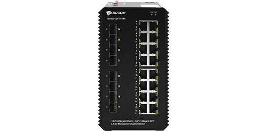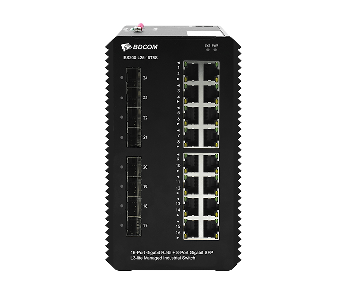 | IES200-L25-16T8S | 16-Port Gigabit RJ45 + 8-Port Gigabit SFP L3-lite Managed Industrial Switch (dual 12~55VDC pheonix power input, 1 Relay-alarm; operating temperature: -40~85° C; lightning protection level of 6KV; IP40; DIN-rail installation) |